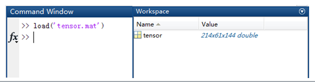 图2 在MATLAB的Command Window输入程序“load(‘tensor.mat’)”即可在workspace上看到大小为214-61-144的三维数组