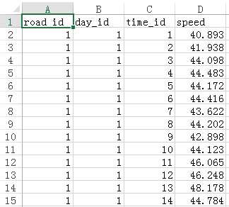 (1) road_id: a unique anonymous identifier for each road segment (see the first column of Fig. 1). As an example, 1 indicates the first road segment;