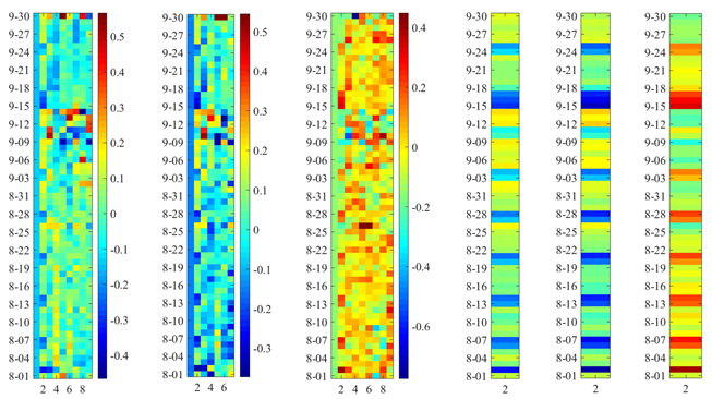 Fig. 4. The visualization of decomposed factor matrix along day dimension, from left to right, the first three heat maps are trained by the 30%, 50% and 70% missing, respectively. Notably, the right three heat maps are the second column of left three heat maps. Under different missing rates, the similar trend is obtained by the tensor decomposition model.