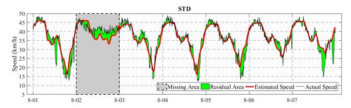 As for the missing data recovery, a road segment (first road segment labeled in the speeddata.csv) is selected, its speed observations from Aug. 1, 2016 to Aug. 7, 2016 is plotted with black line, and the missing areas are also illustrated. As can be seen by red lines, the estimated speed values is really approximate to the actual ones. Even for the heavy missing such as 70%, there are speed observations along four days are completely lost, the tensor decomposition model is able to recover the missing data accurately.