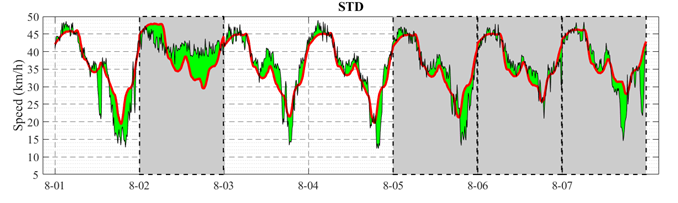 Here, relying on this large-scale (or city-wide) traffic speed data set, some interesting experiments such as missing data recovery and traffic patterns discovery could be conducted. In the submitted article (“Spatial-temporal traffic speed patterns discovery and incomplete data recovery via SVD-combined tensor decomposition” accepted by Transportation Research Part C), based on tensor decomposition, the task of discovering traffic patterns from partially observed data as shown in Fig. 3 and further using these patterns to recover the missing data accurately has been achieved.