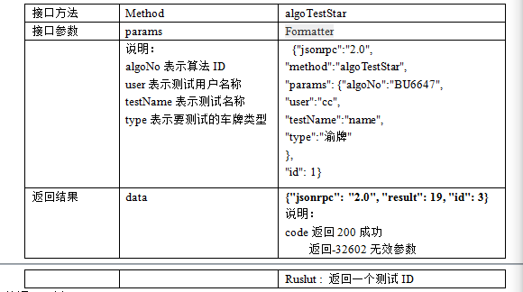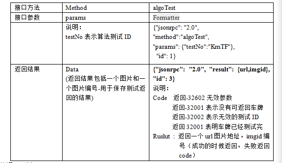 图1 车牌评测平台使用方法流程图 二.接口说明2.1协议格式{ jsonrpc": "2.0", --指定JSON-RPC协议版本的字符串 "method": "mehod", --需要调用的方法名 "params": {},--参数 "id": 1 --已建立客户端的唯一标识id } 2.2服务器和端口号该车牌评测平台hostname-ip: 113.107.6.184 port 端口号:80 api接口地址: http://113.107.6.184:80/plateevaluate/connAlgo, 第三方软件向服务器发送请求的格式为("hostname-ip", port , "api", parametrs) parametrs按如下格式 {\"jsonrpc\":\"2.0\",\"method\":\"algoTest\",\"params\":{\"testNo\":\"KmTF\"},\"id\":1} 2.3方法调用步骤2.3.1开始测试开始测试首先调用的函数是algoTestStar,获取测试编号,其参数格式如表1 表1 开始测试函数 ![]() 方法调用示例 char res1[4096] = {0}; char parm1T[4096] = {0}; char* parm1= "{\"jsonrpc\":\"2.0\",\"method\":\"algoTestStar\",\"params\":{\"algoNo\":\"BU6647\",\"user\":\"zhgg\",\"testName\":\"方纬科技\",\"type\":\"渝牌\"},\"id\": 1}" intnBufferSize = MultiByteToWideChar(CP_OEMCP, 0, (LPCSTR)parm1, -1, NULL, 0); wchar_t *pBuffer1 = newwchar_t[nBufferSize + 1]; memset(pBuffer1, 0, (nBufferSize + 1) * sizeof(wchar_t)); MultiByteToWideChar(CP_OEMCP, 0, (LPCSTR)parm1, -1, pBuffer1, nBufferSize * sizeof(wchar_t)); DWORD dwNum = WideCharToMultiByte(CP_UTF8, NULL, pBuffer1, -1, NULL, 0, NULL, FALSE); WideCharToMultiByte(CP_UTF8, NULL, pBuffer1, -1, parm1T, dwNum, NULL, FALSE); int code1 = request("113.107.6.184",80, "http://113.107.6.184:80/plateevaluate/connAlgo", parm1T, res1); 2.3.2获取测试图片获取测试图片调用函数algoTest,参数如表2,调用成功返回一张图片和图片编号,失败返回error code 表2 获取测试图片函数
