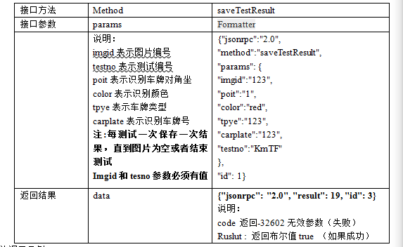 方法调用示例 char parm2[4096] = {0}; strcat(parm2,"{\"jsonrpc\":\"2.0\",\"method\":\"algoTest\",\"params\":{\"testNo\":\""); strcat(parm2, testID); strcat(parm2, "\"},\"id\":1}"); char res2[4096] = {0}; int code2 = request("113.107.6.184",80, "http://113.107.6.184:80/plateevaluate/connAlgo",parm2, res2); 2.3.3保存识别结果获取一张图片函数saveTestResult将保存一次测试结果,该函数的参数如表3。 表3 识别结果保存函数