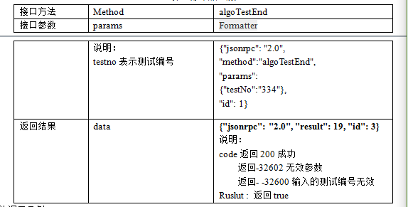方法调用示例 stringresOut = "{\"jsonrpc\":\"2.0\",\"method\":\"saveTestResult\",\"params\": {\"imgid\":\""; resOut += imgID; resOut += "\","; resOut += res; resOut += ",\"testno\":\""; resOut += testID; resOut += "\"}, \"id\": 1}"; request("113.107.6.184",80, "http://113.107.6.184:80/plateevaluate/connAlgo", parm3, res3); 注:res是第三方软件识别的结果,包括"poit":"1","color":"red","tpye":"123","carplate":"123",这些识别结果。 2.3.4结束测试同一类型车牌测试完后,调用测试结束函数algoTestEnd,接下来可以测试其他类型的车牌,该函数的参数如表4。 表4 测试结束函数