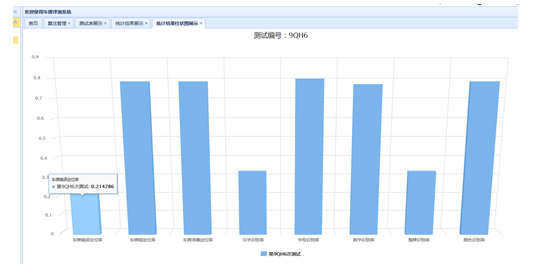 图4 统计结果柱状图 选择菜单中的车牌识别结果表,输入测试编号,点击查询,界面会显示该测试编号下的所有识别结果,如图5,包括图片的编号、车牌左上角右下角的像素坐标、识别颜色、类型、识别车牌号、测试编号。