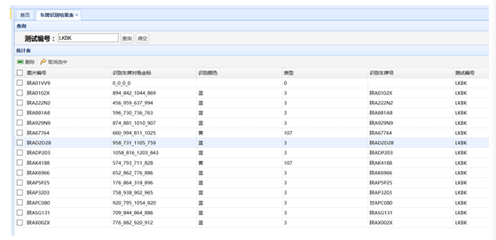 图2 测试记录 选择图2中的测试编号,得到该测试编号的分析结果,如图3,包括车牌错误定位率、车牌粗定位率、车牌准确定位率、汉字识别率、字母识别率、数字识别率、整牌识别率、颜色识别率、各个汉字识别率、数字错误识别、字母错误识别、测试编号。其中数字错误识别、字母错误识别列举了识别错误的数字和汉字